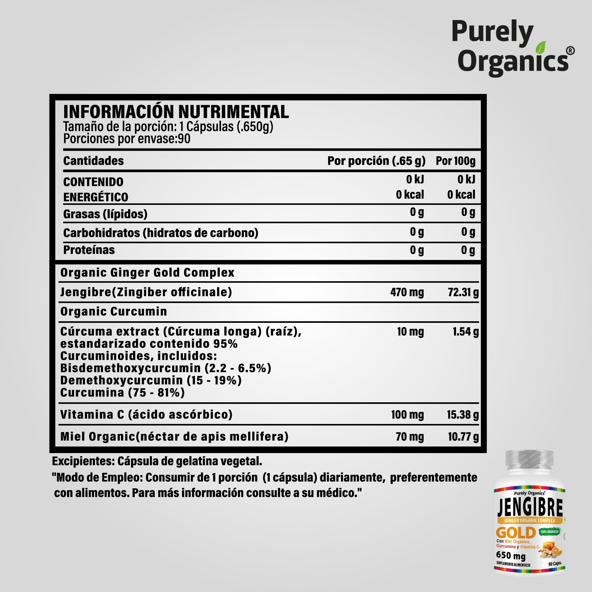 Jengibre (Zingiber officinale), extracto de cúrcuma (Cúrcuma longa), 10 mg / 1.54 g estandarizado al 95% de curcuminoides (Bisdemethoxycurcumin 2.2–6.5%, Demethoxycurcumin 15–19%, Curcumina 75–81%), vitamina C (ácido ascórbico), miel orgánica (néctar de apis mellifera).