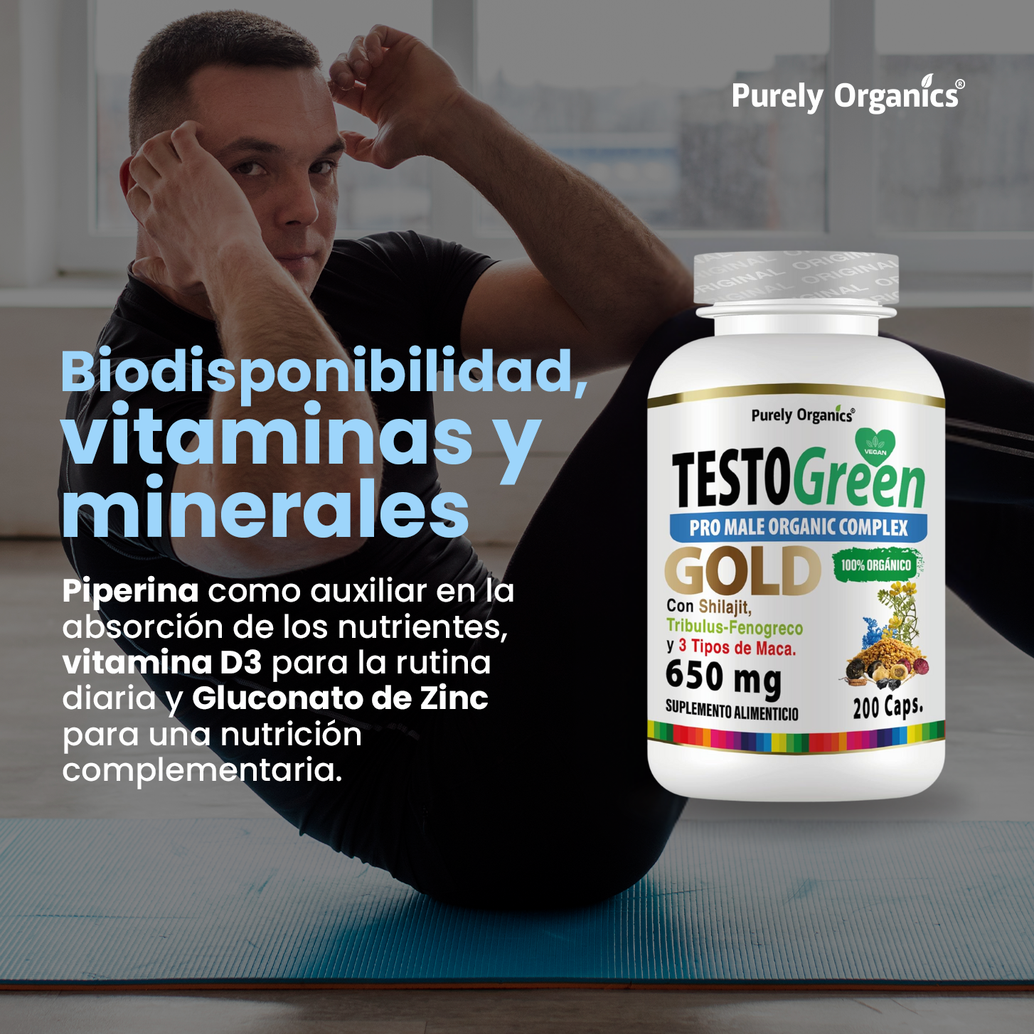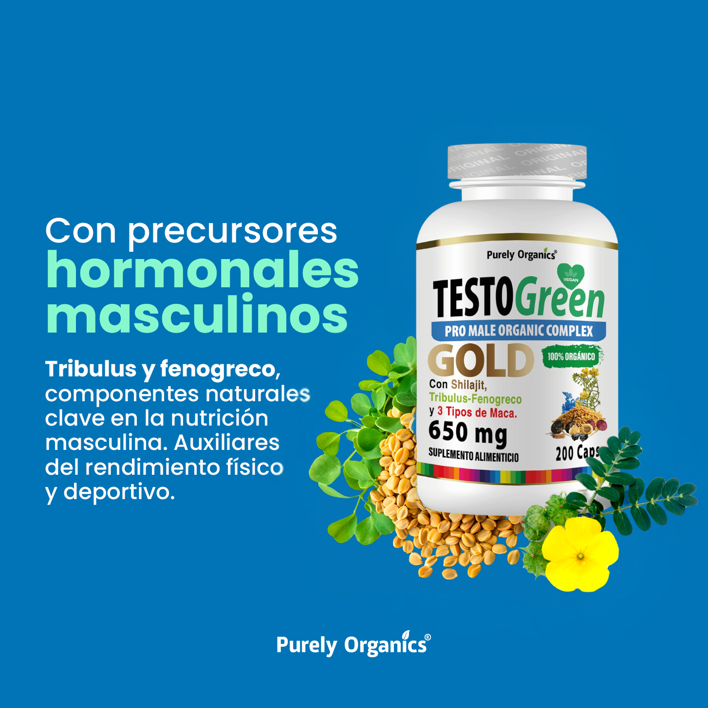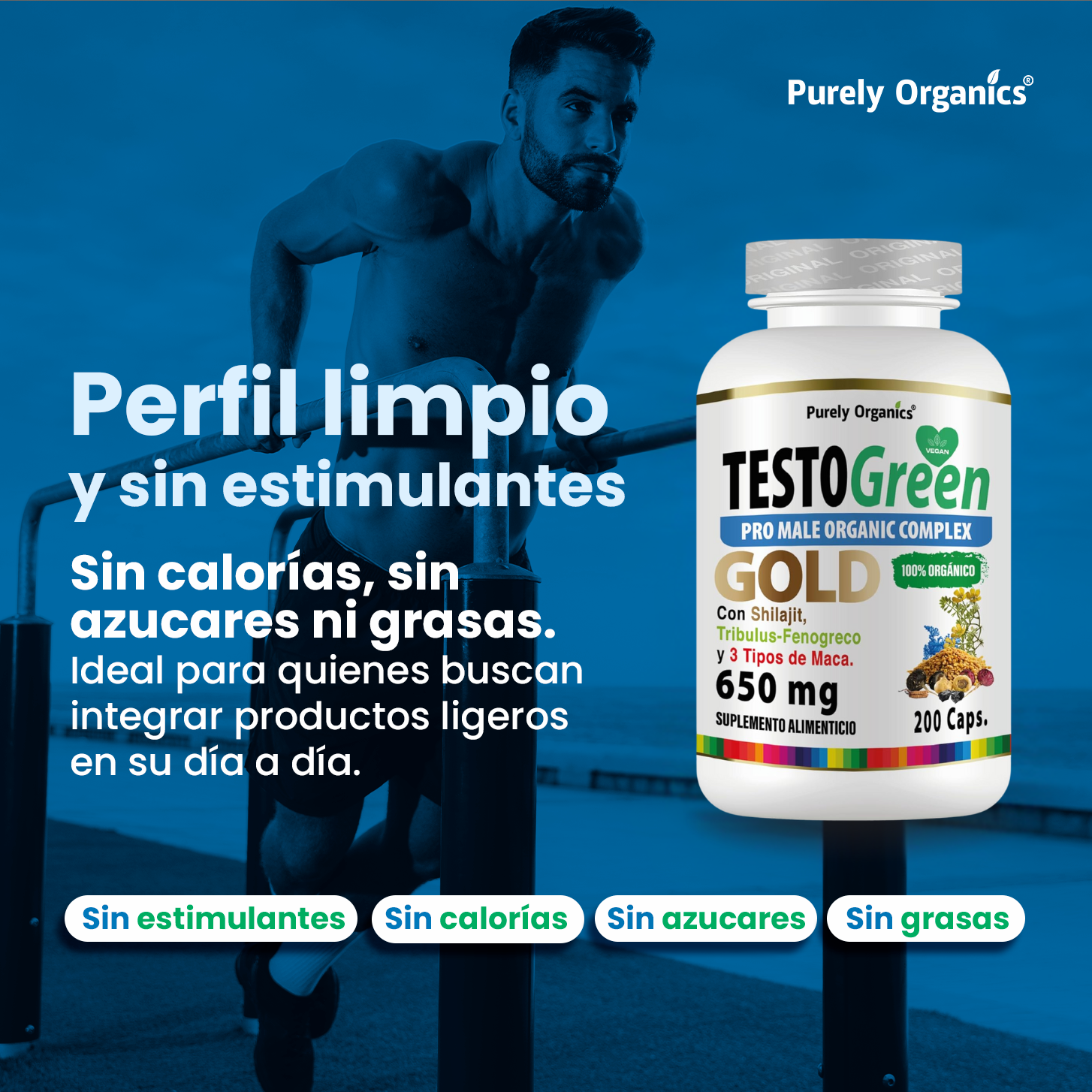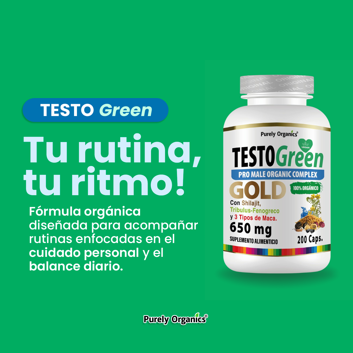 TestoGreen Gold de Purely Organics es un suplemento diseñado para apoyar de manera integral la salud masculina, especialmente en lo relacionado con el equilibrio hormonal, la energía y la vitalidad. Su fórmula combina extractos vegetales orgánicos y adaptógenos tradicionalmente utilizados para favorecer la producción natural de testosterona y mejorar la resistencia física y mental.