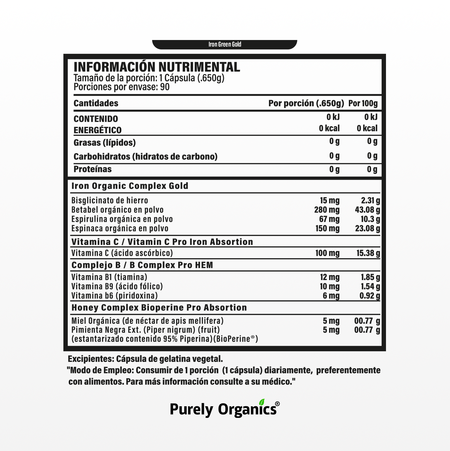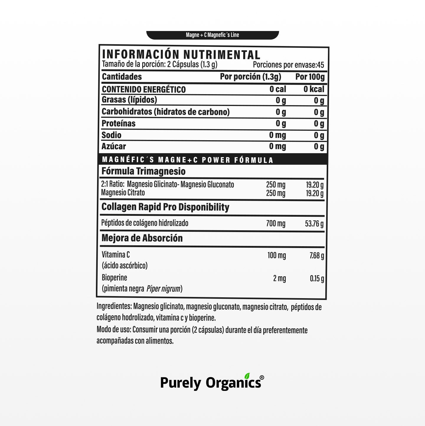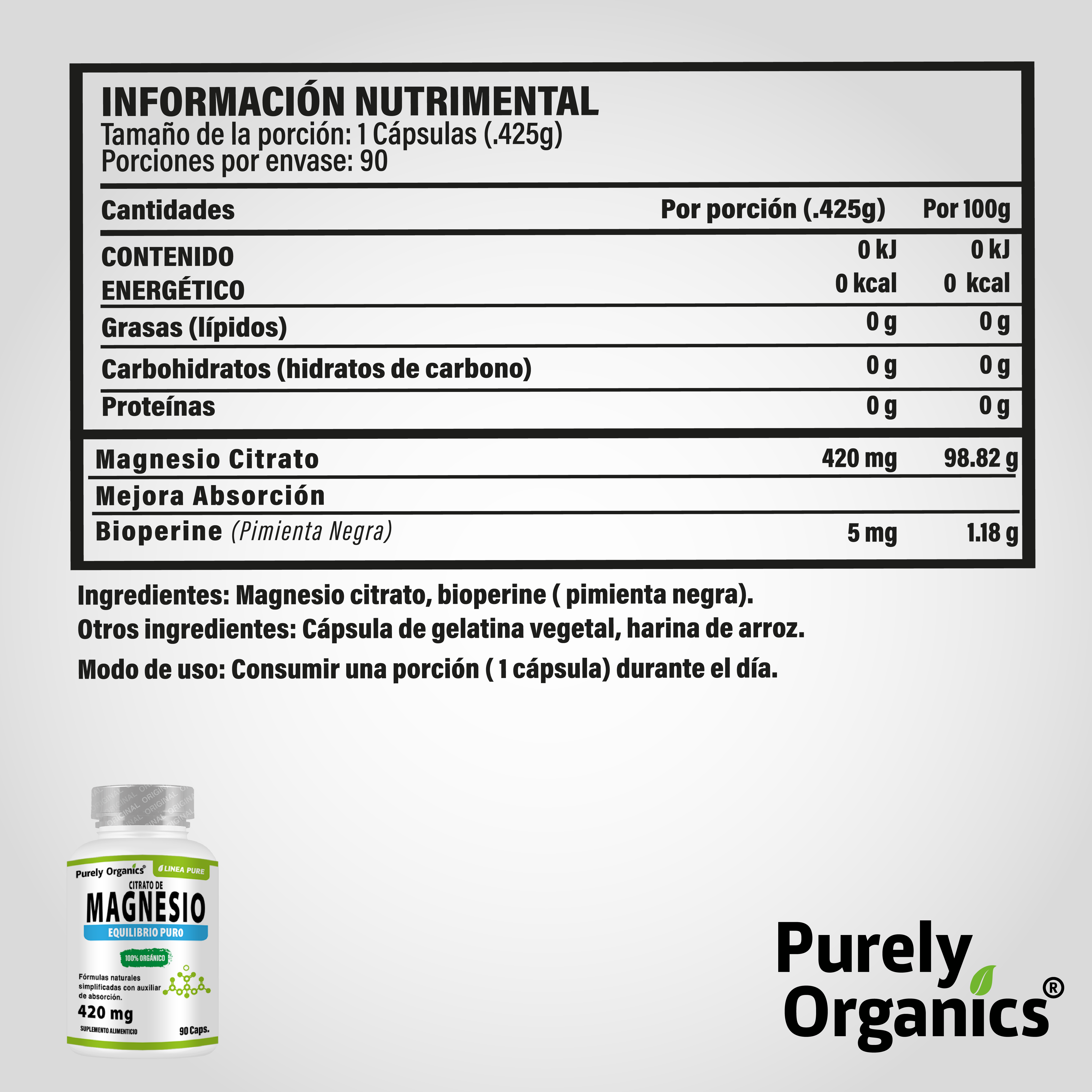 Pure magnesium, with piperine (black pepper) for greater bioavailability. 420 mg per capsule.