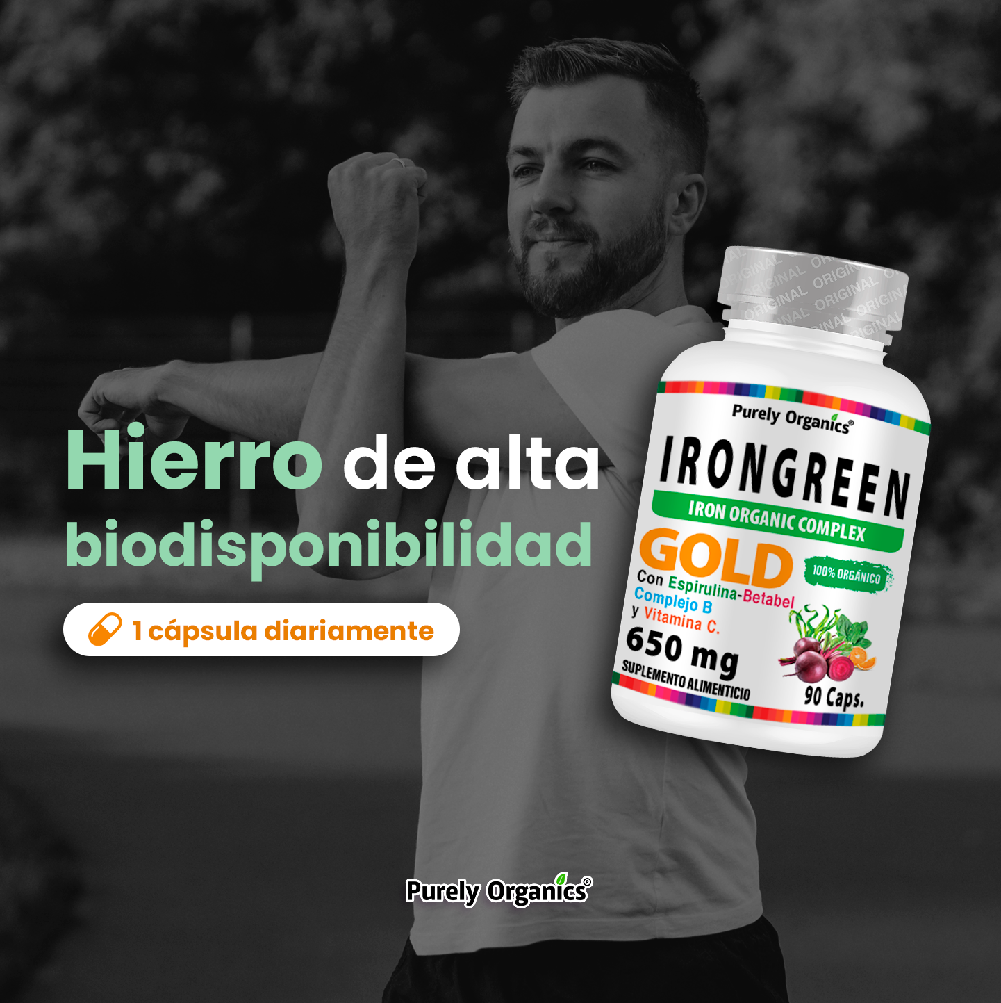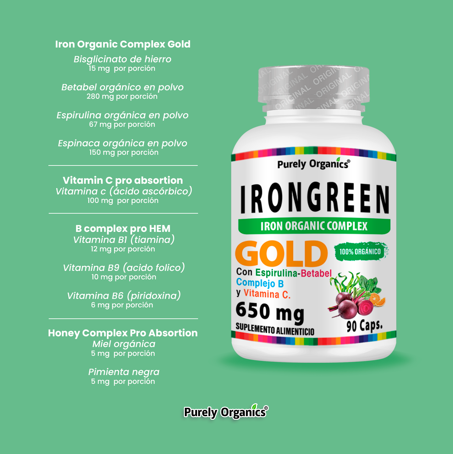 IronGreen is enriched with Spirulina and Beets, known for their natural iron content, complemented by a B Complex and Vitamin C for nutritional synergy. Each capsule is enhanced with Organic Honey and Black Pepper to enhance absorption, designed to offer comprehensive support.