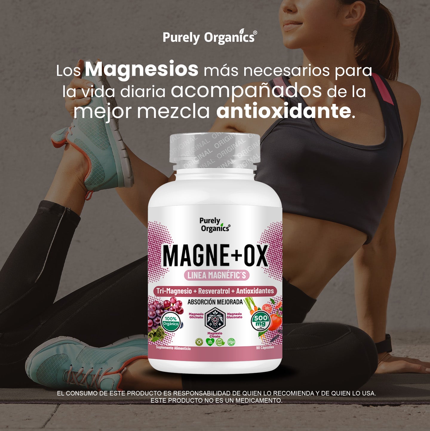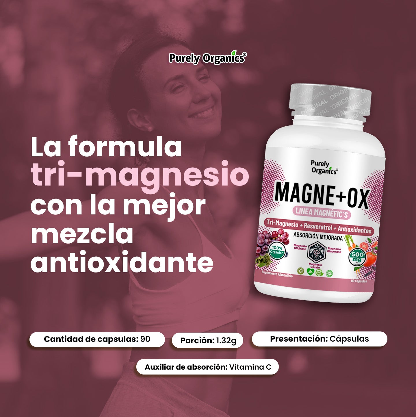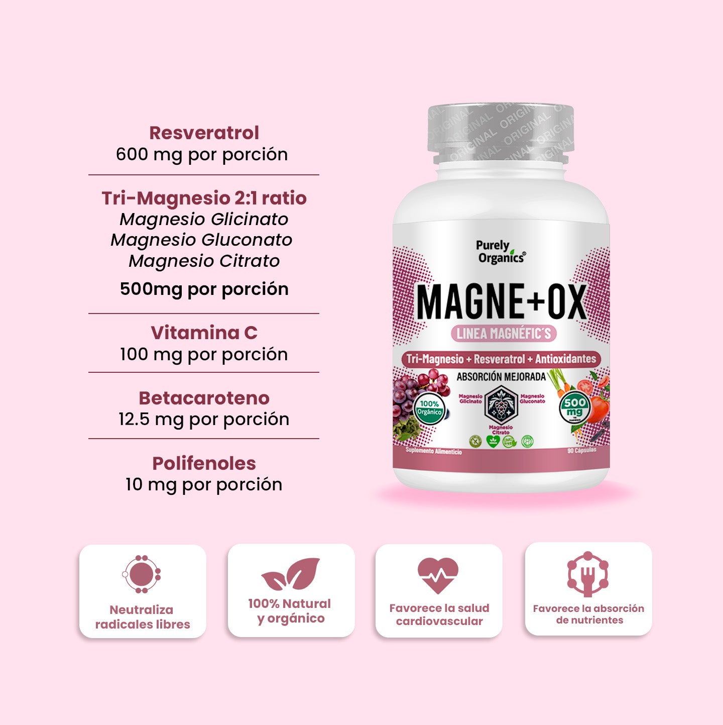 Magne+Ox contains a potent combination of carefully selected ingredients in each 1320 mg capsule. Each serving includes 500 mg of magnesium (in glycinate, gluconate, and citrate forms), 600 mg of resveratrol, 10 mg of polyphenols, 12.5 mg of beta-carotene, 77.5 mg of lycopene, and 100 mg of vitamin C. This formulation ensures a complete and balanced blend for effective supplementation.