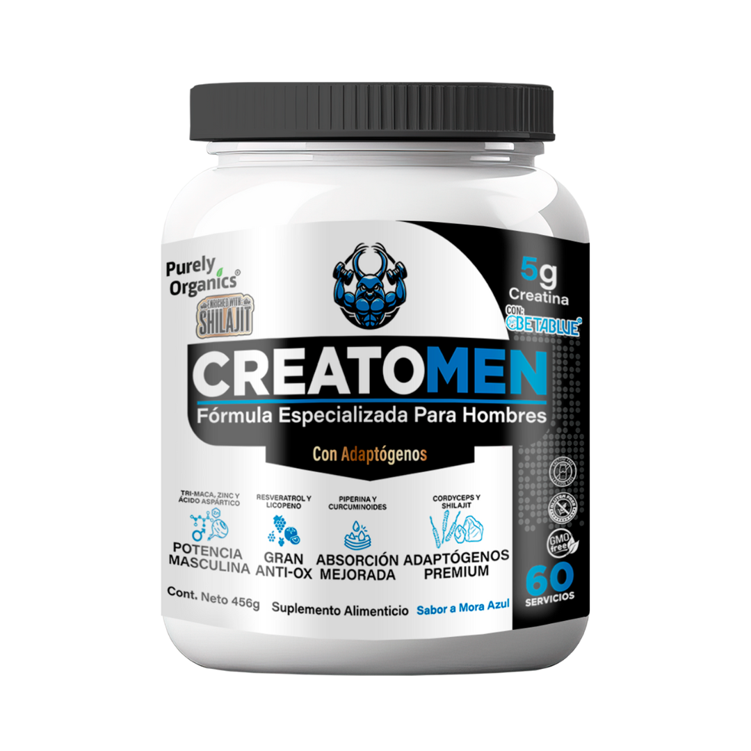 CREATO MEN de Purely Organics es un suplemento integral formulado para hombres que buscan optimizar su desempeño físico durante las etapas de entrenamiento. Cada porción aporta 5000 mg de creatina monohidratada orgánica, una dosis clínicamente respaldada para mejorar la fuerza, energía celular y recuperación muscular. A esta base se suman mezclas funcionales con adaptógenos como shilajit y cordyceps, aminoácidos clave, zinc, vitamina D3, y extractos naturales como maca, fenogreco y tribulus terrestris, que apoyan la producción hormonal y el equilibrio metabólico masculino.